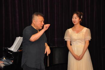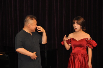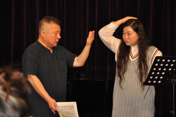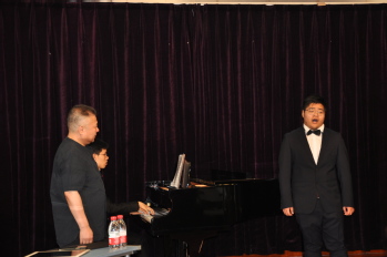 我系共推选4名学生、1名青年教师参加,分别是大一学生杨天明、谢心睿、大三学生马涵、杨家明以及青年教师葛玉华。迟立明老师首先肯定了他们的音色、演唱水平、情感表达,尤其对葛玉华老师演唱的完整性与表现力给予高度评价。然后在咬字的把握、气息的控制、声带放松等演唱细节上耐心的指导与示范,他亲切又接地气的讲解让学生们能够很快明白问题所在,并跟着迟老师一起唱起来。最后迟老师还向众多学生观众提出“打开与撑的辩证统一的理念”,鼓励学生在练习时多去思考其中的联系,获得新的启发,从而提升演唱能力。