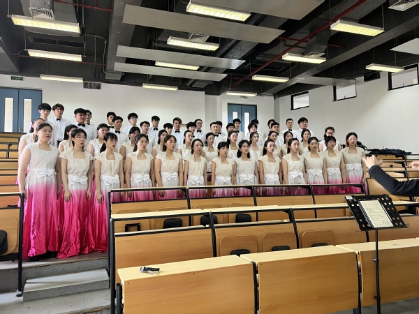 排练现场,一排排整齐的身影、一张张微笑的面孔、精神饱满意气风发,体现出合唱队伍的舞台表现力和感染力,经过一遍遍的练习,合唱队伍默契渐入佳境。尽管排练不易,但在录制视频时,每位学生、每个声部都展现出了自己最好的音色。从他们的歌声中,让我们感受到了对祖国的热爱、超强的凝聚力和必胜的决心!