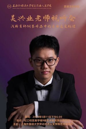 2023年5月11日晚上6:00,艺术教育系在虹口校区教学楼9楼D-111举办钢琴视听会。本次视听会是艺术教育系“音”你而来——音乐艺术周系列活动之一,由青年教师吴兴业老师主讲,主题为肖邦钢琴作品中自由速度的处理。