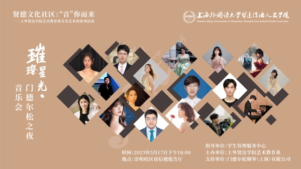 为深入学习贯彻习近平新时代中国特色社会主义思想和党的二十大精神,以立德树人为根本,以社会主义核心价值观为引领,以提高学生审美和人文素养为目标,弘扬中华美育精神,以美育人、以美化人、以美培元,更好的将美育纳入学校人才培养全过程,5月17日晚,教育学院艺术教育系在崇明校区语信楼报告厅举行“璀璨星光·门德尔松之夜”音乐会。崇明区陈家镇副镇长陈展阳、崇明区陈家镇事业办主任任霞、上外贤达学院董事长鲍贤嗣、校长郑方贤、党委副书记王科、副校长徐征、副校长罗玲芳等领导莅临音乐会现场,共享视听盛宴。