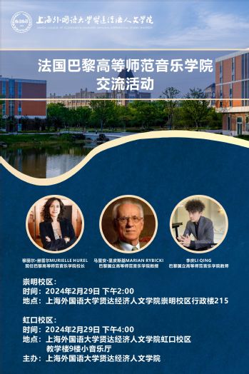 下午16:00,我校艺术教育系在虹口校区教学楼小音乐厅举办音乐交流活动,两校青年钢琴教师代表登台演奏,分别带来肖邦降A大调“英雄”波兰舞曲、肖邦第三钢琴叙事曲、肖邦第四钢琴叙事曲、肖邦圆舞曲Op64.No2、德彪西《水中倒影》等作品,现场气氛热烈,掌声经久不衰。同时,为展现中国民族音乐的独特韵味,艺术教育系的学生代表还在参观交流期间下现场展示了多首别具风格的古筝音乐作品,得到法方到访贵宾的高度好评。
