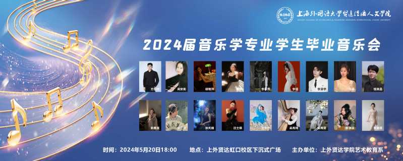 2024年5月20日晚18:00,艺术教育系音乐学专业在虹口校区下沉式广场举办2024届艺术教育系学生毕业音乐会。上外贤达学院党委书记赵荣善、副校长马艳红、招生就业办公室主任陈伟、国际交流学院党总支书记王磊、数字文旅学院党总支书记秦禹权等领导莅临本次音乐会。