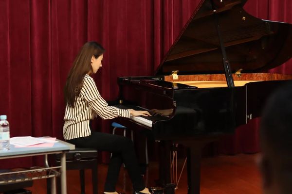 韩老师对学生们的演奏一一指导,并提出了意见与建议:在钢琴演奏的过程中,要注意手型、重音的落点位置;通过整个身体的协调配合赋予手指更多力量,靠虎口打开的反作用力弹出跳感,不改变其音乐的紧张度;在演奏前心里要先思考音乐再开始演奏,弹奏时注意乐句的划分;有些作品或乐句虽旋律较为舒缓,速度偏慢,其实更需要细腻的音乐处理。韩老师以其生动的讲解、深厚的知识储备,为音乐学专业师生们带来了一场教学内容丰富、形式多样的公开课。