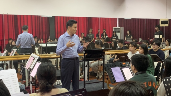 首先鲍董事长一行来到9楼舞蹈教室观看管乐团排练,管乐团演奏《欢迎进行曲》、《苹果派》以及《肖二圆舞曲》三首作品,鲍董事长充分肯定了音乐学专业师生们展现出的良好精神面貌和较高艺术水准,并代表学校感谢大家牺牲假期休息时间参加排练。他希望所有参演人员本着精益求精的艺术追求,再接再厉,力争以一台精彩的演出来为校庆献礼。随后,鲍董事长和郑书记来到D-11教室观看校歌合唱,郑书记对师生们表示了最诚挚的感谢。