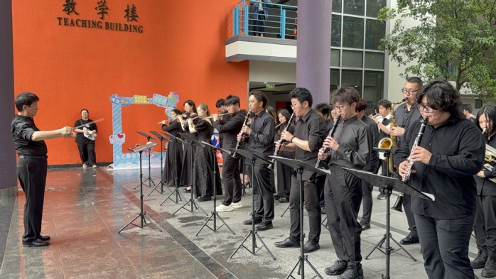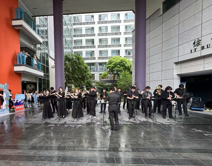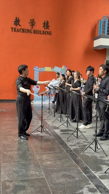 5月20日下午1点,上海外国语大学贤达学院虹口校区内洋溢着青春的欢声笑语。值此毕业生返校拍摄毕业照之际,音乐学专业学生管乐团以一场别开生面的校园音乐快闪活动,为毕业季增添了一抹动人的艺术色彩。音乐学专业学生管乐团在绿树掩映的校园中,以《世界赠予我的》、《歌唱祖国》、《我只在乎你》等经典曲目串联起青春的回忆与祝福,用音符为毕业生送上最真挚的告白。