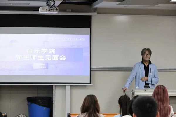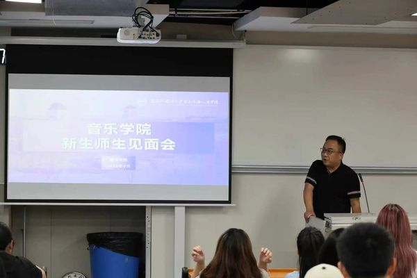 文曙光副院长简单讲解师资规模、学科背景、科研成果及教学特色等维度,并介绍由骨干教师与青年学术带头人组成的教师团队,让新生直观感受到师资团队的专业实力。结合自身从艺经历,他以“音乐是诚实的艺术”寄语新生,鼓励大家带着热忱与老师同行,在敢试敢闯、不惧失败的探索中,找到属于自己的艺术“声”彩。