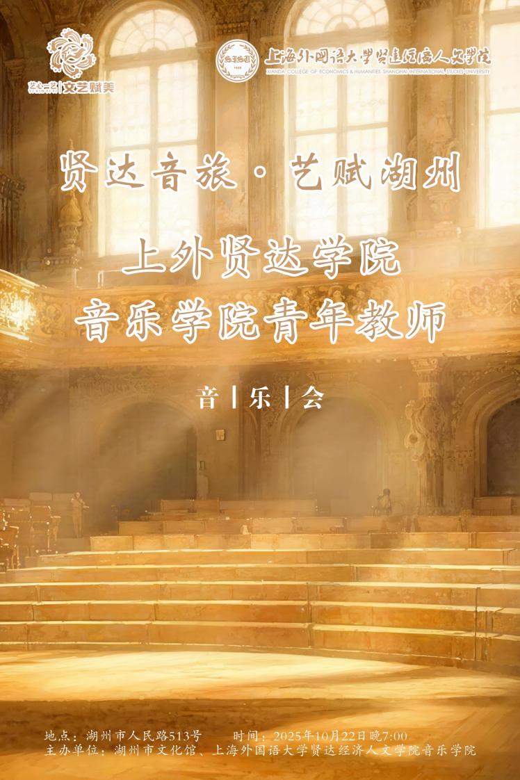 为落实学校综合改革部署、推动艺术学科产教融合,2025 年 10 月 22 日,上外贤达学院音乐学院青年教师团队应湖州市文化馆邀请,赴湖州举办“艺心一艺·文艺赋美——上外贤达学院音乐学院青年教师专场音乐会”。校地双方领导,包括上外贤达学院音乐学院副院长文曙光,院长助理金鸽平,湖州市文化馆馆长章静颖,副馆长冯辕等出席活动。