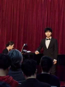 音乐学专业推荐的四名学生先后登台演唱,禹周昊教授逐一针对其演唱提出建议,如禹教授强调腹式呼吸的重要性,可以保持气息深沉稳定;学生在平时练习中要注重咬字饱满,并且辅音要清晰但不过重;情感表达方面先突出强弱对比,再增加戏剧性的表现力,避免机械性演唱。
