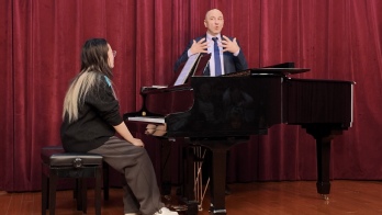 音乐学院两名大二“精英计划”的学生黄诗媛、张郅睿先后登台,分别演奏李斯特《爱之梦》第三首、肖邦《第三叙事曲》。两位同学在展现演奏技能的同时,分别融入自己对作品的理解与情感表达,呈现出别具风格的浪漫派作品。布鲁贝克教授在细致聆听后,从作品的整体意境出发,重点解析了如何通过触键力度与踏板控制的微妙配合来营造作品的演奏氛围。并且教授通过讲解加示范的方式,更生动、细腻的讲解作品的创作背景、演奏特色、演奏技巧等,使学生们对这首经典作品的演绎有了更深层次的理解。