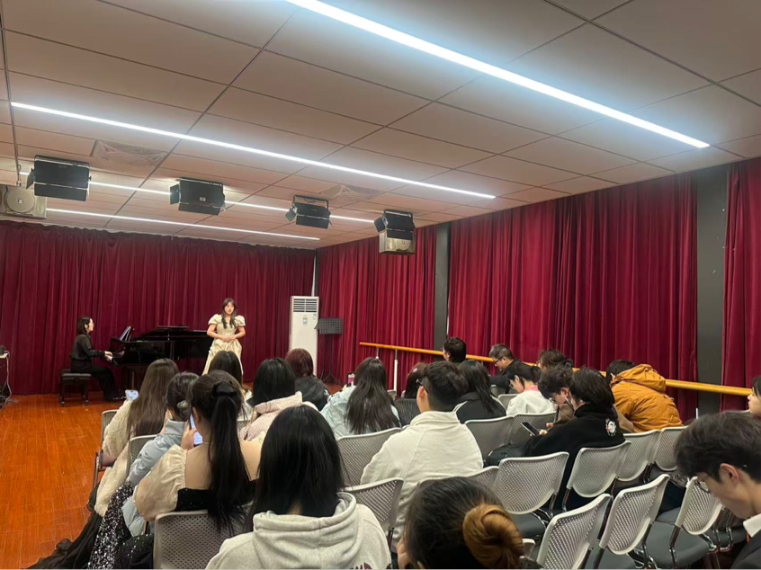 2025年11月26日9点,2025-2026学年第一学期声乐、钢琴演唱演奏会在虹口校区教学楼9楼小音乐厅如期举行。本次演唱演奏会由声乐专场率先登场,几位同学依次带来经典作品,女高音的清亮通透与男中音的浑厚沉郁交替流转,柔缓旋律铺陈浪漫诗意,戏剧化的强弱处理演绎歌剧选段的情绪张力,将古典声乐的优雅与深情传递到每一个角落。