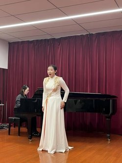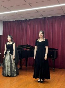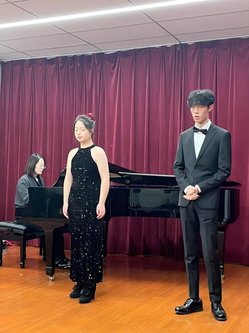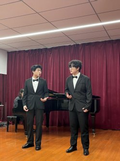 音乐会现场氛围庄重而热烈,一曲曲承载着时代记忆的经典曲目轮番上演,让观众在歌声中重温峥嵘岁月。开场环节,陆宛声与高一凡两位同学以二重唱形式演绎《松花江上》,歌声中满含对故土的眷恋与对民族苦难的深切共情。随后,陆一鸣同学带来独唱《三月桃花心中开》,清澈的嗓音搭配细腻的情感表达,既展现出歌曲中对美好生活的向往,也暗含着革命年代里人们对光明的执着追求。紧接着,吴瑨与王晨成同学合作演唱《游击队之歌》,明快激昂的节奏、铿锵有力的歌声,展现出新时代青少年昂扬向上的精神风貌。音乐会尾声,施忆恒与刘沁同学共同演唱《世间哪有这样的情》,细腻的声线勾勒出革命岁月中真挚的情感,将整场音乐会的氛围推向高潮。