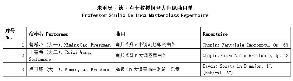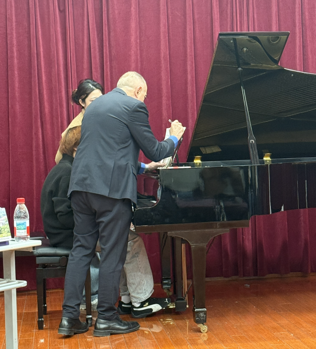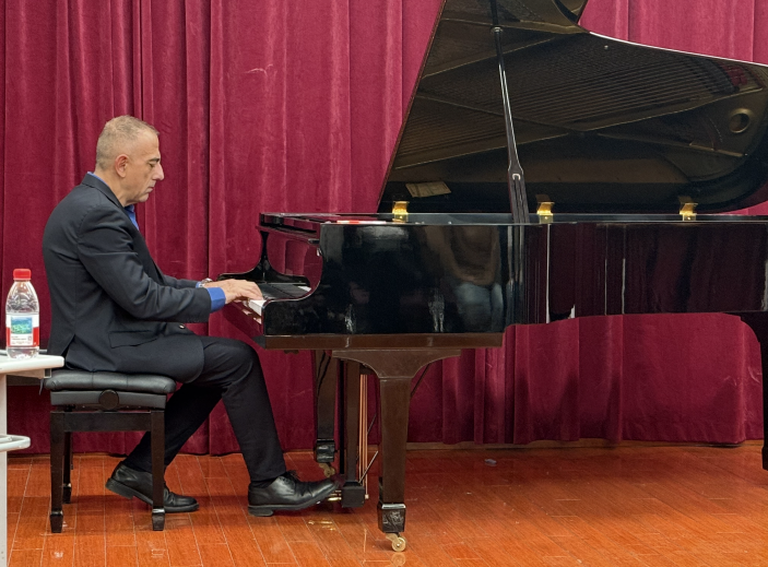 最后,卢卡教授亲自登台演奏舒曼《阿拉伯风格曲》Op. 18。他以精湛的演奏技巧、充沛的情感张力以及对作品的深刻解读,将音乐中的深刻内涵诠释得淋漓尽致,获得了现场师生的阵阵掌声。