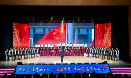 2025年12月4日,崇明风瀛洲剧场内歌声激昂、法治氛围浓厚。上海外国语大学贤达经济人文学院音乐学院受邀参与“民革·博爱·普法”国家宪法日法律服务活动暨崇明区第37届宪法宣传周主题活动,以艺术形式弘扬宪法精神。此次宪法活动受到高度关注,相关演出片段已在看看新闻频道官方账号、崇明新闻栏目播出,成为上海法治宣传教育的生动案例。副校长梁中贤亲临现场慰问师生,由音乐学院理论教研室曹化勤老师、佟殷老师全程指导排练、声乐教研室全体教师与40余名合唱团学生以饱满热情共同演绎经典曲目《走向复兴》。这场活动不仅是一次艺术与法治的深度融合,更成为学生们将课堂知识转化为社会责任感的生动实践课堂。