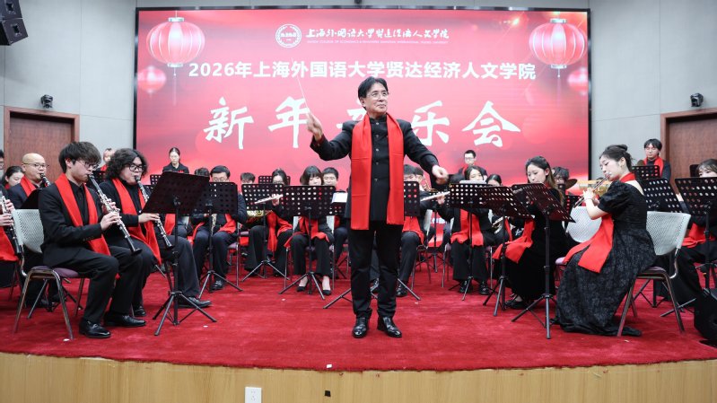 音乐会伊始,学校党委书记赵荣善发表新年贺词。他代表学校向音乐学院全体师生致以由衷感谢,过去一年,学院的每一步成长、师生的每一份耕耘,都如同乐章中跳动的音符,共同谱写了上外贤达昂扬向上的奋进旋律。展望 2026 年,学校满怀憧憬与信心,愿全体师生以更开放的胸怀拥抱世界,以更真挚的情感联结彼此,用智慧与热情共同书写贤达崭新的篇章。